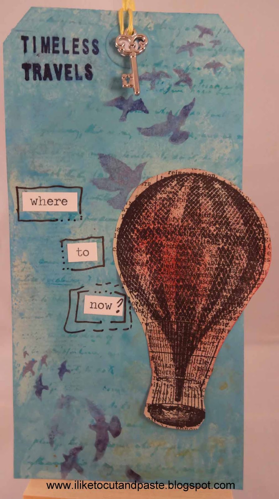 I used distress paints salty ocean and broken china for the background. I stamped a script stamp using broken china distress ink and the birds (Tim H's) with dusty concord. The hot air balloon is from Hampton Arts and the Timeless Travels is from Just Rite stamps (I think). Those are Tim H's chit chat stickers too. And a key. :)