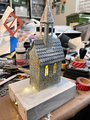 So here is the front of the church. I am mounting it on a vignette box-the 2nd largest one. I painted it with white gesso. The tiny lights are on.